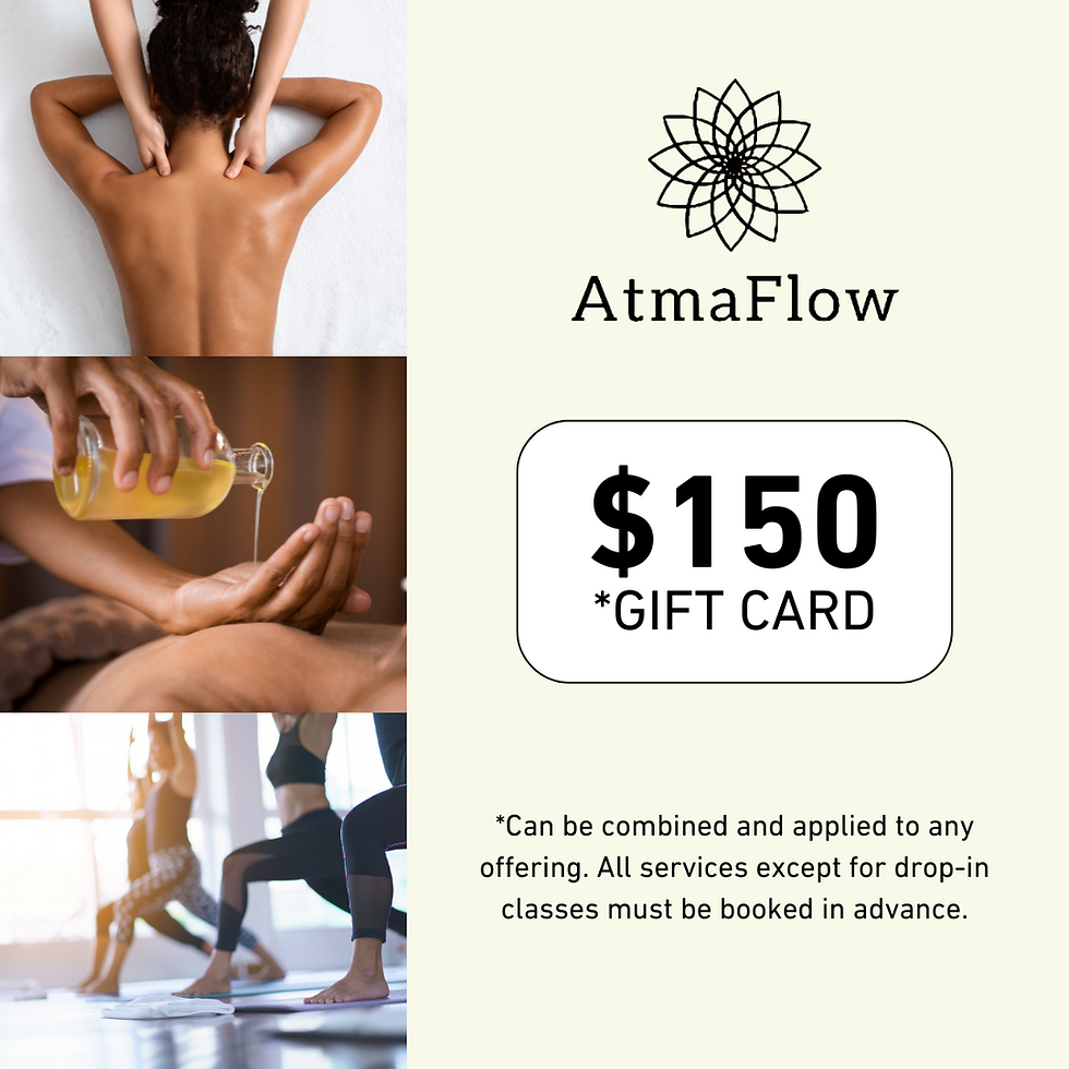 Give the gift of self-care to a loved one who deserves that special treatment. AtmaFlow gift cards can be applied to massage, classes, and more. See the massage menu and classes offerings for more details.